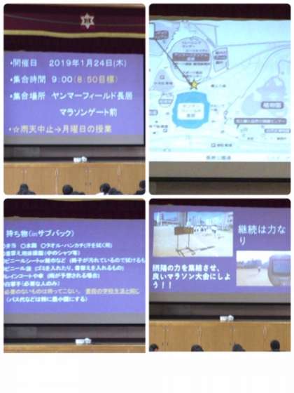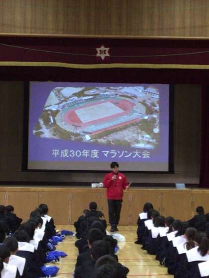 6時間目、1、2年生は体育館に集合し、明日のマラソン大会について確認しました。