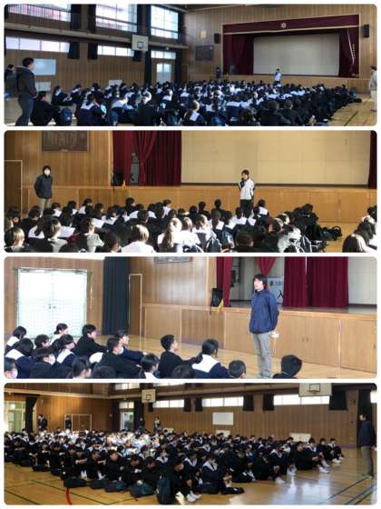 校外学習から帰ってきた2年生は体育館に入りました。体育館では玉置先生から今日の振り返りの話がありました。