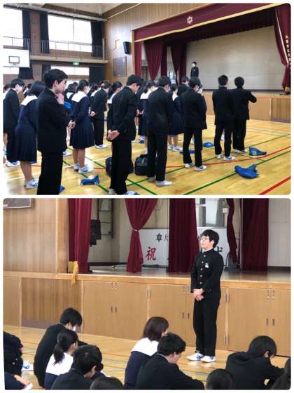 近藤先生、喜田先生からは「これから入試が続きますが、周りの人のことを考えて行動してください。自分の入試が終わったとしても、まだ入試に臨まなければいけない人もいます。しっかりサポートできるようになってください。そして良い卒業式を迎えましょう。」「明日は入試ですが、身だしなみをもう一度チェックしてください。」という話がありました。