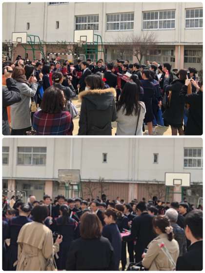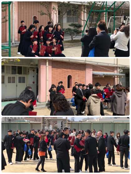 花道を抜けた卒業生は中庭で、歓談と記念撮影を行いました。