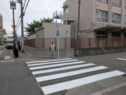 昨日午前中に、平野警察により本校西南角の交差点に南北に渡る横断歩道が設置されました。