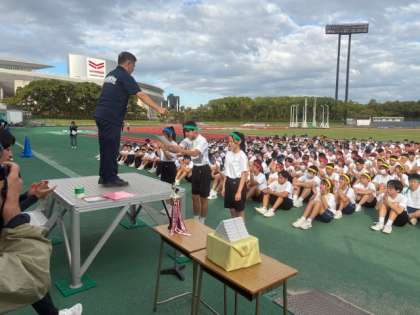 成績発表、表彰がありました。優勝したクラスには表彰状とトロフィーが、準優勝のクラスには表彰状が授与されました。写真は3年生の授与場面です。