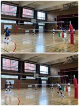 体育館では男子バレーボール部が文の里中学校と合同練習をしていました。 ブロック...