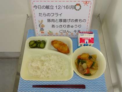今日の給食では、マダラの切り身をフライに加工したものを使用します。