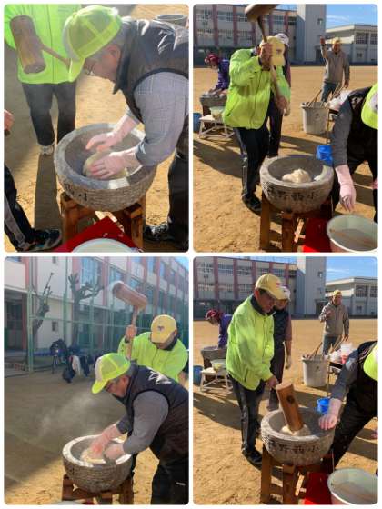 本日は、平野西小学校の運動場にて晴天の下、お餅つきが行われています。稲は「稲魂」や「穀霊」が宿った神聖なものだと考えられることから、神様が食べる神聖な食べ物とされていました。そのような食べ物を食べる時期はお正月が縁起の良い日であるとされ、餅つきが行われたといいます。