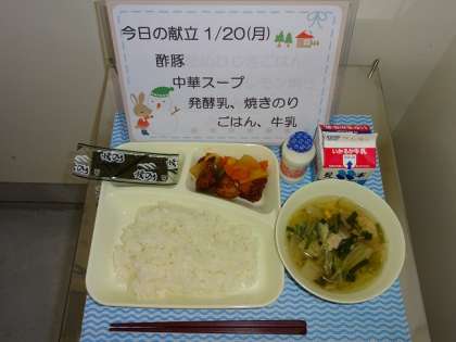 今日の給食の酢豚は、豚肉のほか、たまねぎ、たけのこ、にんじん、ピーマンを使用し、砂糖、酢、しょうゆ、ケチャップで味つけしたものにしています。