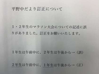 マラソン大会について 公開日 2020/01/30 更新日 2020/01/30 お知らせ 明日、1月31日(金)は、白鷺公園にてマラソン大会が行われます。体育授業での練習の成果を発揮してください。 午前の3・4限に2年生 午後の5・6限に1年生 の時程で行われます。 本日、配付した「平野中だより」のマラソン大会についての記載に誤りがありました。訂正いたします。