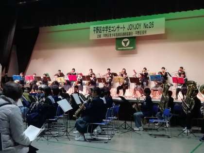 平野区中学コンサートJoyJoyNo.26その2 公開日 2020/02/09 更新日 2020/02/09 出来事 最後は各校2年生の合同演奏に合わせて全中学生ならびに観客の皆さんと「花は咲く」の大合唱でフィナーレをむかえました。