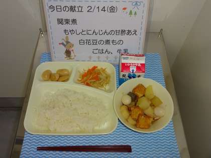 今日の給食では、砂糖、しょうゆ、塩の味付けで煮ものにしています。
