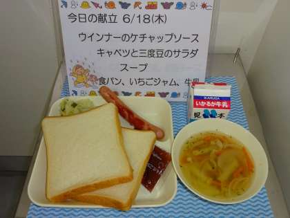 今日の給食では、ゆでたソーセージに、ケチャップ、デミグラスソース、ウスターソースを合わせて煮、水溶きでん粉でとろみをつけたソースをかけています。