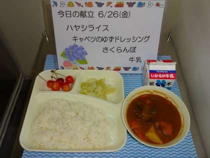 サクランボは桜の果実の総称で、食用となるのは、桜桃(おうとう)と呼ばれる実桜(みざくら)類の果実です。トルコおよびコーカサス地方が原産と考えられています。食用の歴史は古く、プリニウス(23〜79年ごろ)の著書「博物誌(77年)」によると、ルキウス・リキニウス・ルクッルスが第三次ミトリダテス戦争(紀元前75〜65年)において、黒海南岸のケラソスに滞在した際にサクランボの木を発見し、ローマへ持ち帰ったとされています。その後、ヨーロッパ各地に伝わり、16世紀以降になって本格的な栽培が始まったようです。日本へは、1872〜73(明治5〜6)年に導入され、雨により実が割れやすいことから、収穫期に雨の少ない東北地方や北海道を中心に栽培されるようになりました。国内生産のおよそ80%は生食用で、そのほかは缶詰などの加工用となっています。生食用の出荷が5〜7月にほぼ限定されることから、初夏を告げる代表的な果物となっており、給食では年一回、6月に使用するようにしています。