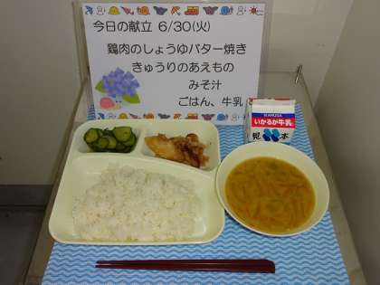 今日のの給食では、しょうゆで下味をつけた鶏肉に溶かしたバターをかけてオーブンで焼き、風味よく仕上げています。