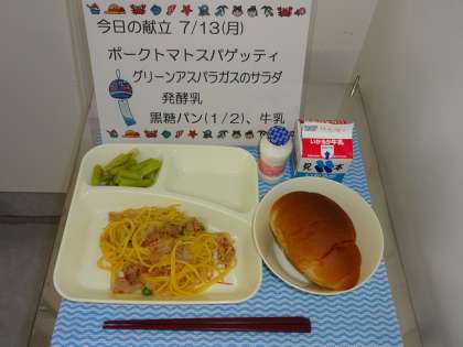 今日の「ポークトマトスパゲッティ」では生のトマトを使用して調理することでさわやかな風合いを出しています。