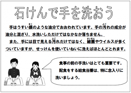 手には目で見える汚れだけでなく、細菌やウイルスが多く存在しますが、石鹸を使って、ていねいに洗うことでそのほとんどを取り除くことができ、食中毒だけでなく、様々な感染症の予防に役立ちます。