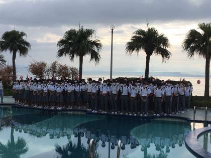 ホテルのプールサイドで学年全体の集合写真を撮りました。