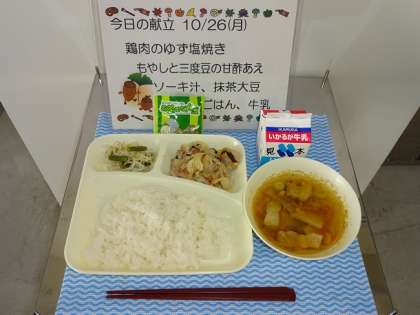 今日の給食では、豚ばら肉とだいこん、にんじん、白ねぎ、えのきたけ、切り昆布を使ってソーキ汁としました。