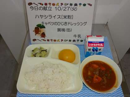 大阪市学校給食の「ハヤシライス」は、通常、小麦粉を油で炒めてつくったブラウンルウを使用して調理していますが、今回は「食物アレルギー対応サポート月間」として小麦粉を使わずに米粉(上新粉)を使ってハヤシライス風に仕上げています。