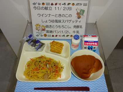 献立名 ・ウインナーときのこのしょうゆ風味スパゲッティ(きざみのり)