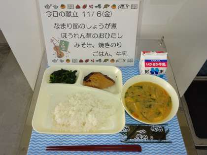 今日の給食では、しょうが、砂糖、みりん、しょうゆ、料理酒で味つけした煮つけにしています。