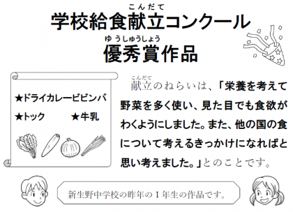 今日の献立は、昨年度の学校給食献立コンクールの優秀賞献立で、新生野中学校から出品された献立です。