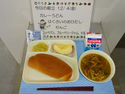 今日の給食では、昆布とけずりぶしでとっただしに、牛肉、うすあげ、野菜を加えて、カレールウの素、しょうゆなどで味つけしたカレー汁に、ゆでたかんめんを加えています。