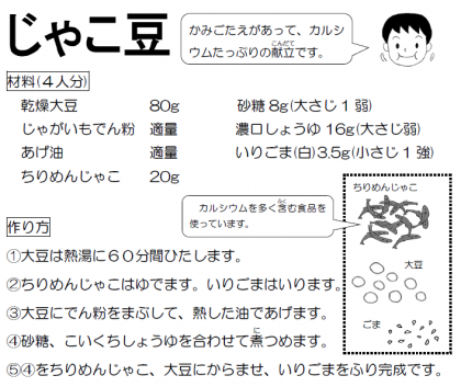今日の「じゃこ豆」は不足しがちなカルシウムや鉄をたっぷり含んだ献立で、年令問わず人気のある献立です。ご家庭でも作りやすい献立ですので、作り方を紹介します。ぜひ料理の一品としてご利用ください。