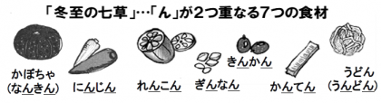 冬も本番となってきており、4日後の12月21日(月)には冬至を迎えます。冬至の日には、かぼちゃを食べて、ゆず風呂に入って無病息災を願うという風習があるのはよく知られています。それ以外にも、「ん」が2つ重なる食べ物を食べると、運気が良くなるといわれ、下の7種類の食材を「冬至の七草」としています。