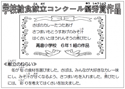 今日の献立は、昨年度の学校給食献立コンクール優秀賞作品です。都島区 高倉小学校6年生の児童が作成した献立です。