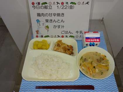 今日の給食では、さけ(鮭)、つきこんにゃく、うすあげ、だいこん、にんじん、青ねぎを具とした「かす汁」で使用しています。味つけには薄口しょうゆ、白みそ、赤みそを使用しています。