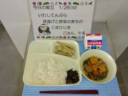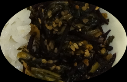 「ごまひじき」は、ふりかけや佃煮のようにご飯に添えて食べてもらう一品です。今日の給食では、乾燥のだいこん葉、ひじきを各々ぬるま湯でもどし、油で炒め、砂糖、みりん、濃口しょうゆ、少量の湯、いりごまを加えてさらに水分が減るまで炒めています。ごまのプチプチとした感じがたいへんおいしく、家庭でも簡単に作ることができます。だいこん葉がない場合は、青じそ、水菜、にんじん、ごぼう、しいたけ、ちりめんじゃこなどお好みの材料を使ってもできますし、ひじきだけでもおいしくできます。また、ご飯だけでなく、豆腐や肉類にのせるなどいろいろな応用ができます。
