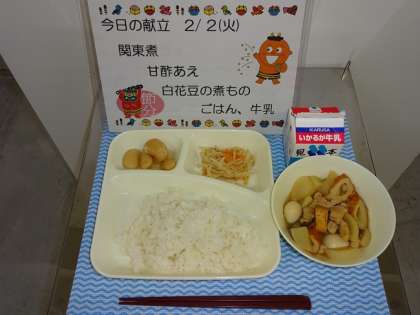 今日の給食では、砂糖、塩、うす口しょうゆの味付けで、スチームコンベクションオーブンを使用して煮含めています。