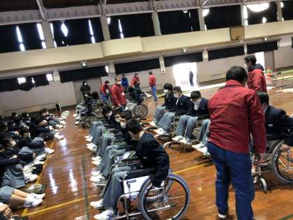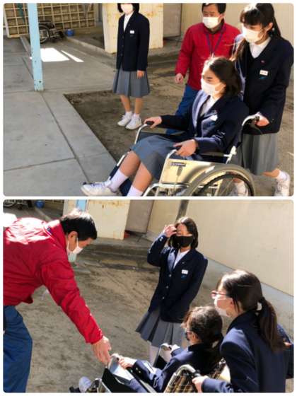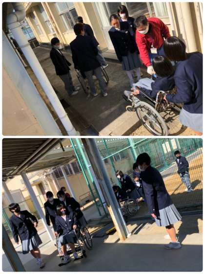 1年生車いす体験その2 公開日 2021/02/10 更新日 2021/02/10 出来事 ふだん何気なく通っている場所も車いすでは、なかなか思うように移動できないことがわかりました。午後からは、3組・4組の生徒が取り組みます。