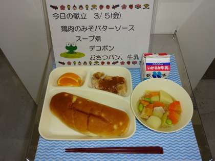 今日の給食では、八丁みそ、赤みそ、砂糖、バターでソースをつくり、塩、ワインで下味をつけて焼いた鶏肉にかけています。