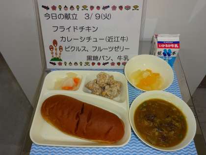 これまでの給食のメニュー中で、群を抜いて人気の高いのは、「から揚げ」と「カレーライス」です。そこで今日はこれらを組み合わせたようなメニューとなっています。残念ながら給食物資の都合上、ご飯でなくパンの給食となってしまったため、カレーライスの方は、シチューとなってしまいましたが、こんな融通の利かない学校給食であっても皆さんの思い出のひとつになれば、たいへんうれしく思います。これからも、食生活での栄養バランスを整え、健康的な毎日を送ってください。
