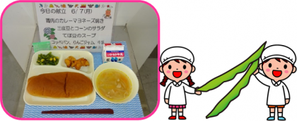 今日の給食では、コーンとともにワインビネガー、砂糖、塩、うす口しょうゆ、オリーブ油でつくったドレッシングであえています。