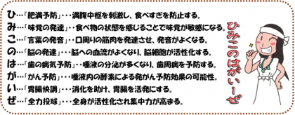 食事の時によく噛むことは、健康を保つため、おもに下のような8つの効果があると考えられ、これらの頭文字をとって「卑弥呼の歯がいーぜ」という標語であらわされています。