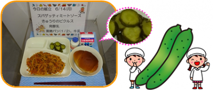 今日の給食では、スチームコンベクションオーブンで蒸したきゅうりを砂糖、塩、ワインビネガー、薄口しょうゆを合わせた調味液につけこみ、ピクルスにしています。