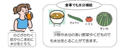 そのためには、水分だけでなく塩分を補給するタブレット、スポーツドリンク、経口補水液なども有効ですが、食事の時に、スイカなどの水分の多い食品や、みそ汁、スープなどの汁物を利用するということも考えましょう。とくに汁物は、具として野菜や海藻などをうまく使うことで、ミネラル成分もしっかりとることができますので効果的です。