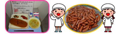 今日の給食では、ケチャップ、デミグラスソース、ウスターソースを合わせて煮、でん粉でとろみをつけたソースをゆでたフランクフルトソーセージにかけています。