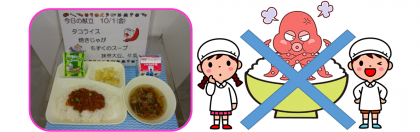今日の給食では、具材として牛挽肉、豚挽肉、たまねぎ、グリンピースを使用し、トマトピューレ、ケチャップ、カレー粉などで味つけして炒めたソースをご飯の上にのせて食べるようにしています。また、もずくを使ったスープを添え、沖縄風の献立としてまとめています。