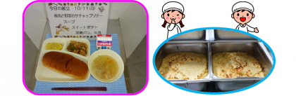 今日の給食では、ゆでてつぶしたさつま芋に、砂糖、バター、牛乳、クリームを加えて、バットに入れて、スチームコンベクションオーブンで焼き、教室で切り分けてもらっています。ちなみに今日使用しているさつま芋は、徳島県産の鳴門金時で、甘みが強くおいしい品種です。