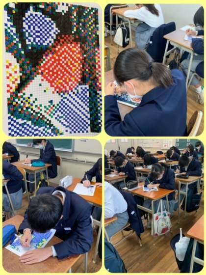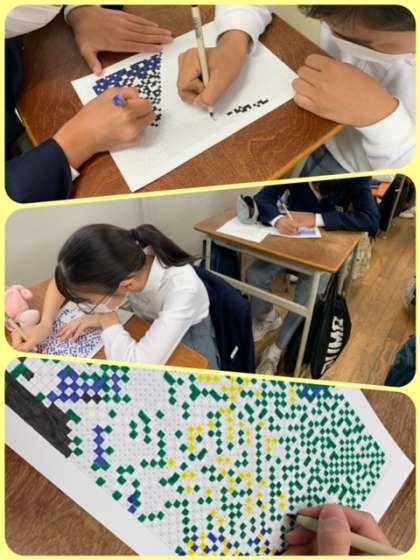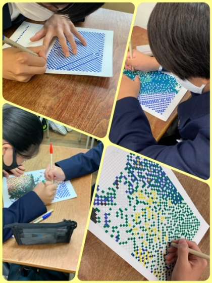 2年 モザイクアート 公開日 2021/10/25 更新日 2021/10/25 出来事 今週29日金曜日の文化発表会に向けて、学年で1枚の大きなモザイクアートを製作中です。全てを繋ぎ合わせるまで、どんな作品ができあがるのかわかりません。黙々と取り組んでいます。