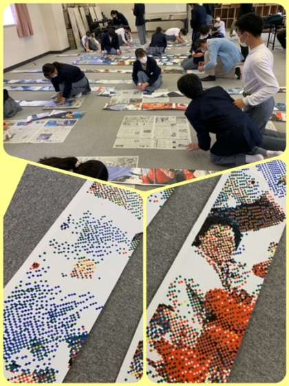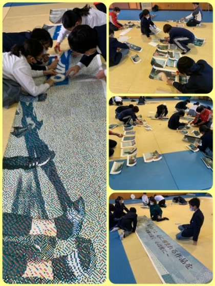 文化発表会、体育大会の取組み 公開日 2021/10/27 更新日 2021/10/27 出来事 各学年のモザイクアートも張り合わせの段階に入ってきました。今日の放課後、1、2年生はモザイクアートを貼り合わせました。どんな作品になるのか楽しみです。