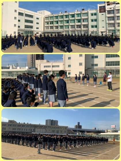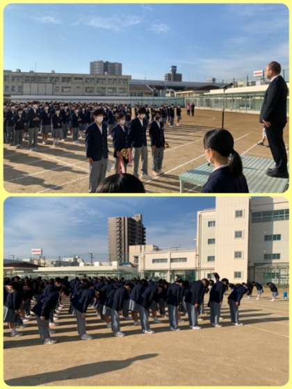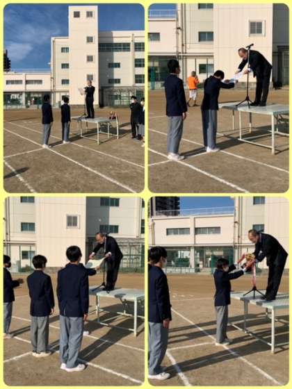 全校集会 公開日 2021/11/01 更新日 2021/11/01 出来事 新型コロナウイルス感染のリスクを避け、全校集会を中止にしていましたが、今日は良いお天気のもと今年度初めての全校集会を行いました。陸上部、サッカー部の賞状伝達後、校長先生から文化発表会の高評をいただきました。
