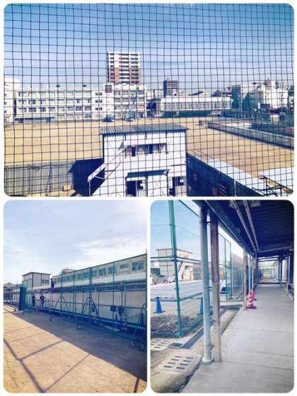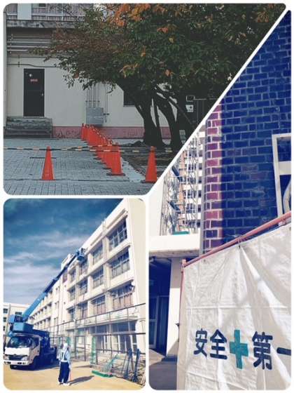 体育館と集会場の空調工事は今月末までに完了予定ですが、校舎の外壁工事やプールの新設工事が月曜日から始まります。生徒の皆さんも登下校の際に、正門への石畳のアプローチ周辺は通らなくなってしまうので、1号館1階の廊下を通って下さい。また、1年生は来週末頃に仮説の渡り廊下を通って校内を移動することになります。不便ですが、工事が完了するまで我慢して下さいね。