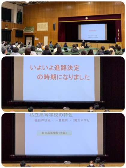 本日はお忙しい中、進路説明会にご参加いただきありがとうございました。進路主事から進路の予定や進学先、受験の仕組みについて説明がありました。来週から始まる進路懇談を充実したものにするために、ご家庭でお子様と進路の手引き(冊子)を読んでいいただければと思います。本日ご参加できなかったご家庭には、月曜日に進路の手引きをお子様に配布します。