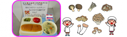 給食では、現在、しいたけ、えのきたけ、ぶなしめじ、なめこ、まいたけ、エリンギ、マッシュルームの7種類が使用されています。今日の給食では、ぶなしめじ、エリンギ、マッシュルームの3種をクリームシチューの具として使用しています。