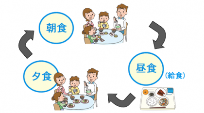 健康的な体を維持するためには、朝、昼、夕の食事をバランスよく食べるということが大切です。そのためにも3食とも主食、副菜を組み合わせてしっかり食べることが望ましいです。また、それぞれを決まった時間に食べることで、生活の全体のリズムも整いやすくなります。習慣として身につけることで、健康的な生活を送りましょう。