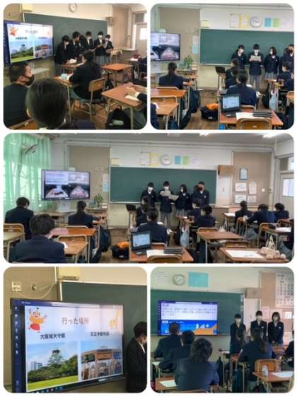2年生 校外学習学級報告会 公開日 2021/12/02 更新日 2021/12/02 出来事 2年生は6時間目に校外学習の報告会を行いました。どの班もパワーポイントの資料に工夫を凝らした素晴らしいプレゼンテーションでした。投票によって各クラスの代表を決め、来週月曜日に学年全体の発表会をします。