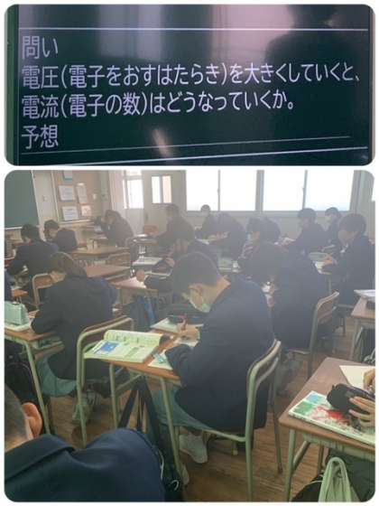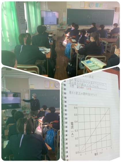 電圧と電流の関係について予測を立て、オームの法則について学習しました。